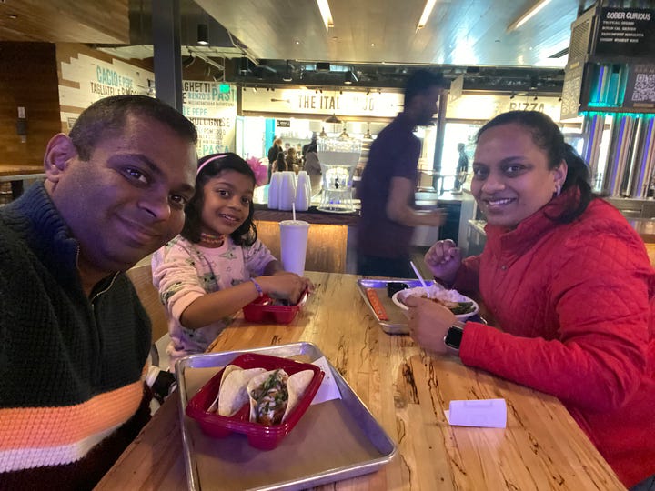 Took off on good Friday & checked out some local places. First we went to the nearby HEB (a famous Texas local superstore), then to Legacy west (a live, work, play & eat concept). Went to a food court Legacy Hall & it was a fun place. Me & Nila tried Velvet Taco & Elizabeth tried an asian.