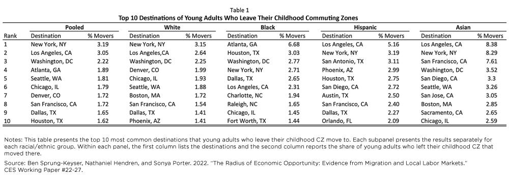 Interesting study on the how young adults migrate and how far they go by four major races and income brackets.
